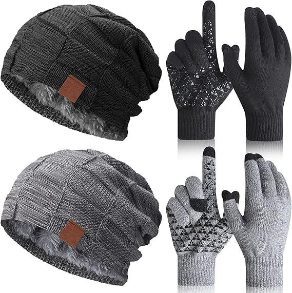 4 Pack Winter Hats for Men Beanie and Gloves Set, Winter Slouchy Beanie Hat Warm Gloves Lined Knit Thick